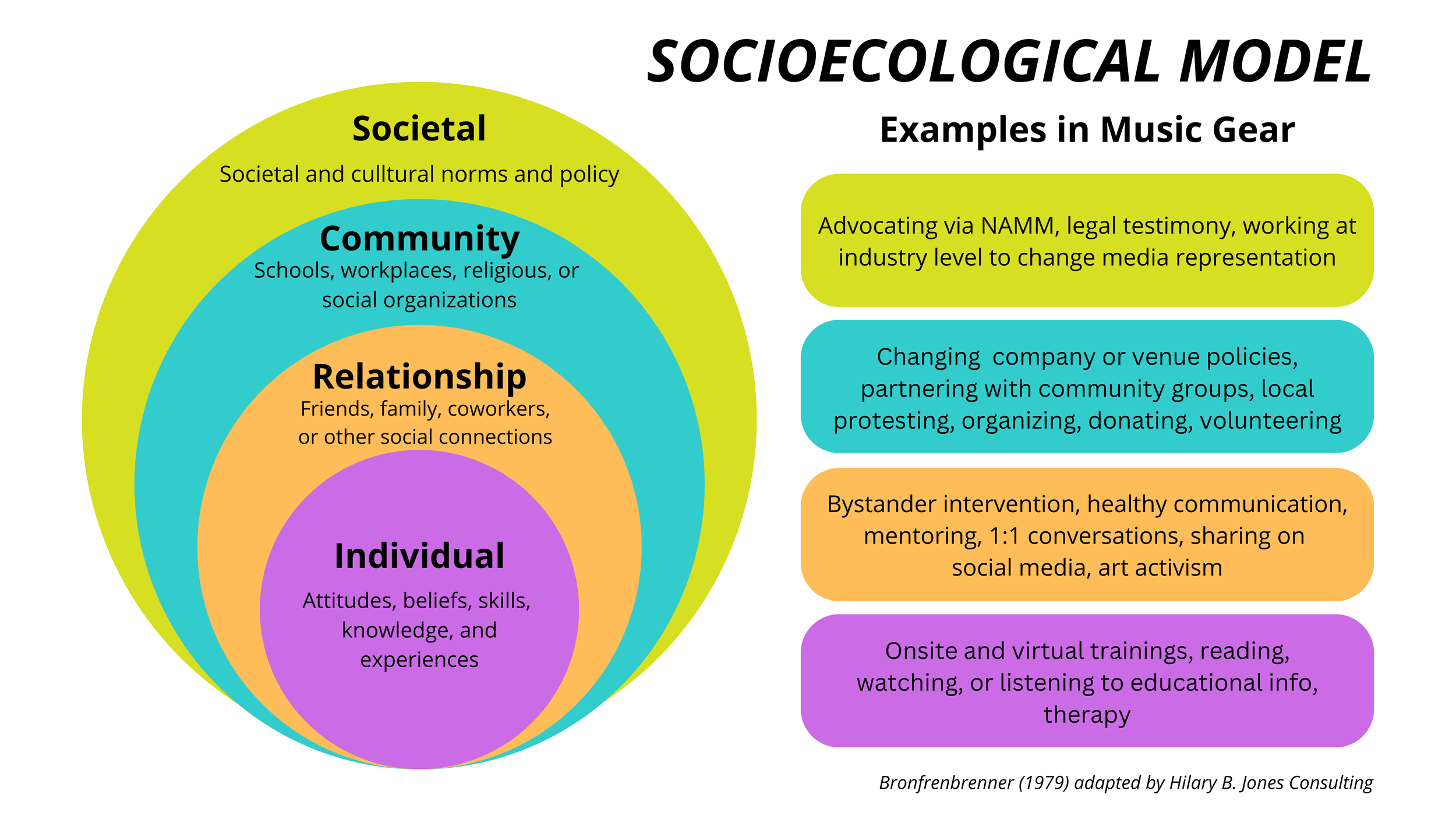 If you think of a concentric circle, the first circle in the middle is the individual. Change at this level might include things like individual education, training, or skill-building. The next circle out is the relationship level. That includes interactions with parents, peers, colleagues, and other 1:1 interactions in your world. Change at this level might look like practicing role-playing, communication, conversations, or bystander intervention training, or mentoring. The next level our is the community level. This would include the influence of schools, workplaces, churches, hospitals, and other institutions. Change at this level would include policy change at the level of the indivdiual school or workplace, company volunteering. The largest ring of our concentric circle is the systemic level. This includes things that impact everyone within the society, such as laws, regulations, and the media. Change at this level could look like working at a industry-level through a group like NAMM to make change around laws.